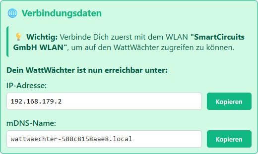 Wenn du den WattWächter über den Access Point einrichtest, werden IP-Adresse und mDNS-Name am Ende des Einrichtungsvorgangs angezeigt.