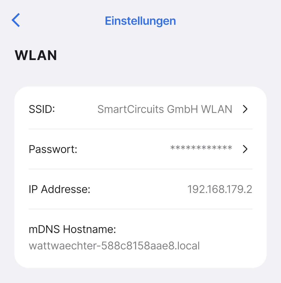 Der mDNS-Name hat das Format wattwaechter-XXXXXXXXXXXX.local (wobei XXXXXXXXXXXX die MAC-Adresse des Geräts ist). Damit kannst du das Gerät im Browser erreichen, ohne die IP-Adresse zu kennen — z.B. http://wattwaechter-3432df43d331.local.