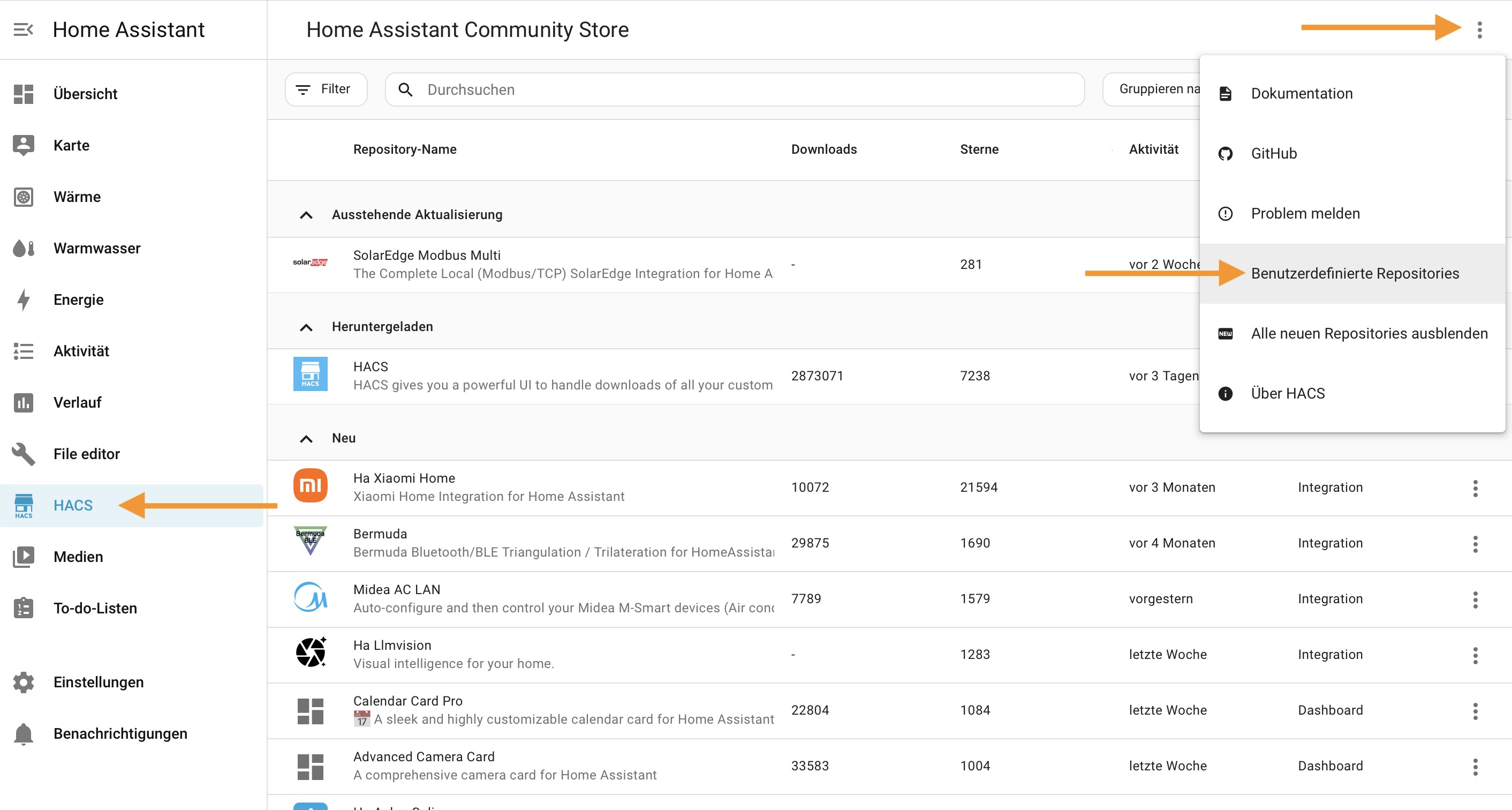 Öffne in Home Assistant die Seitenleiste und navigiere zu HACS. Klicke oben rechts auf das Drei-Punkte-Menü () und wähle Benutzerdefinierte Repositories.