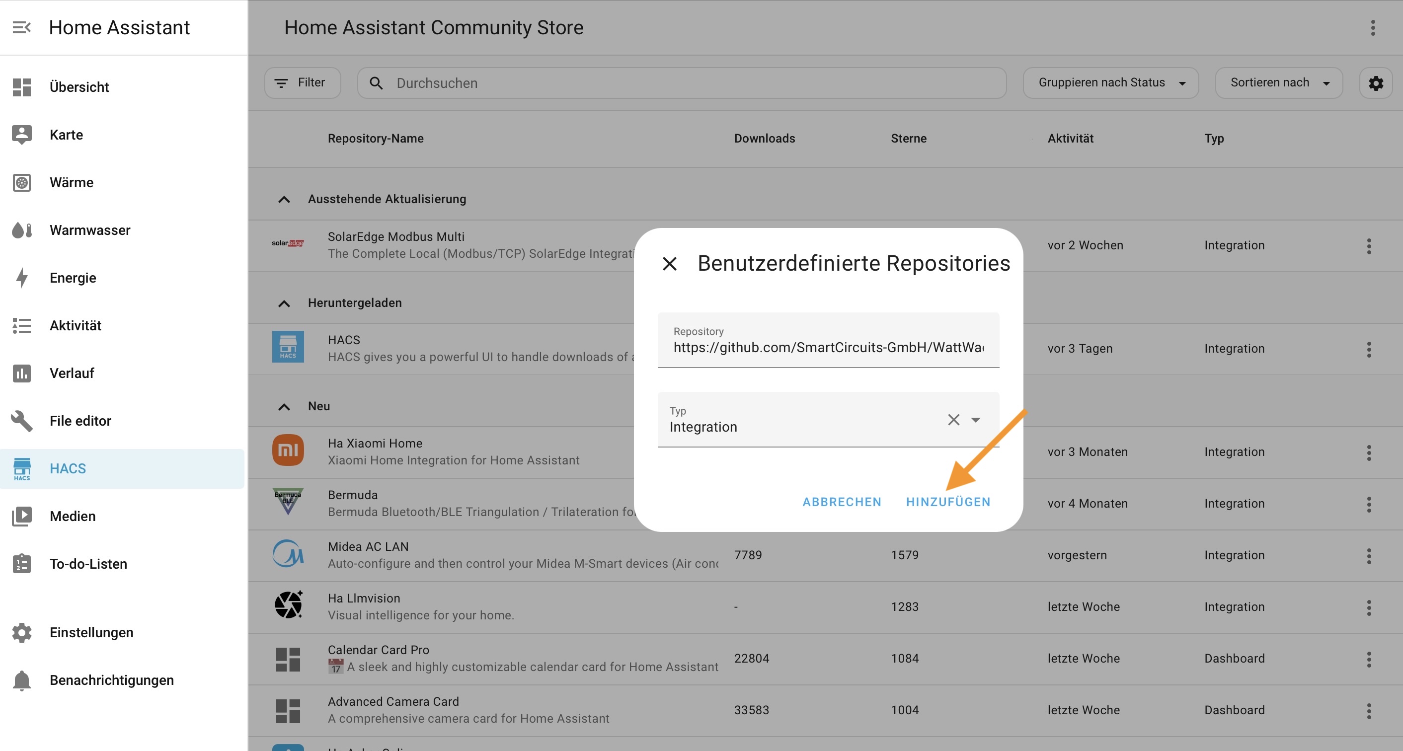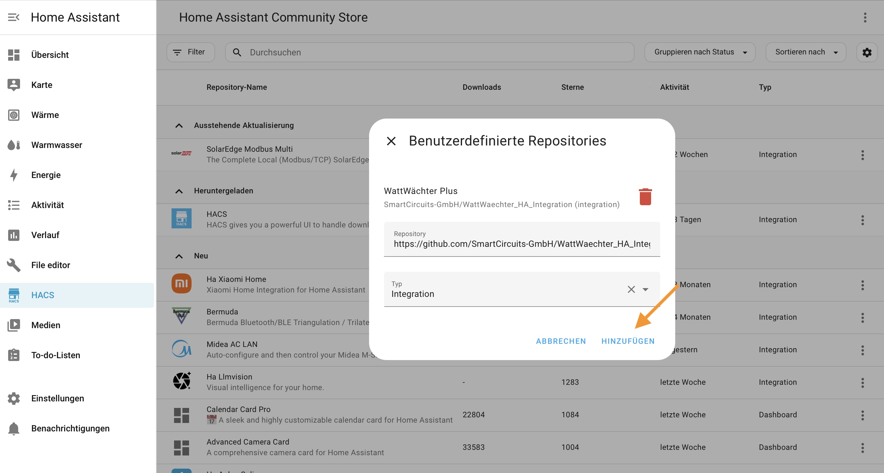 Das Repository WattWächter Plus wird erkannt und angezeigt. Klicke erneut auf Hinzufügen, um es deinem HACS Store hinzuzufügen. Danach erscheint die Integration wie jede andere HACS-Integration in deiner lokalen HACS-Übersicht und kann von dort heruntergeladen und aktualisiert werden.