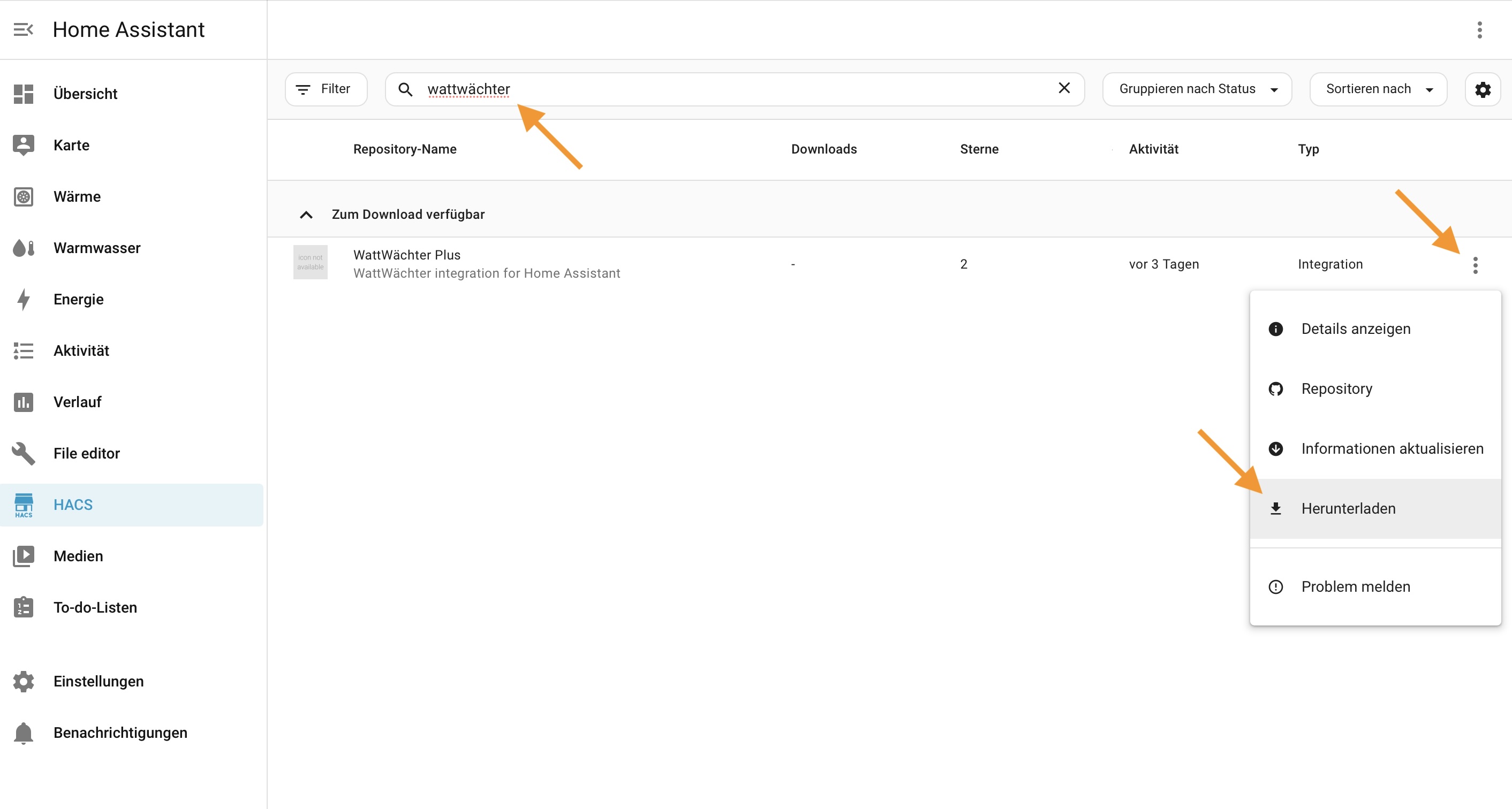 Suche in HACS nach WattWächter. Du findest die Integration unter Zum Download verfügbar. Klicke auf das Drei-Punkte-Menü () und wähle Herunterladen.