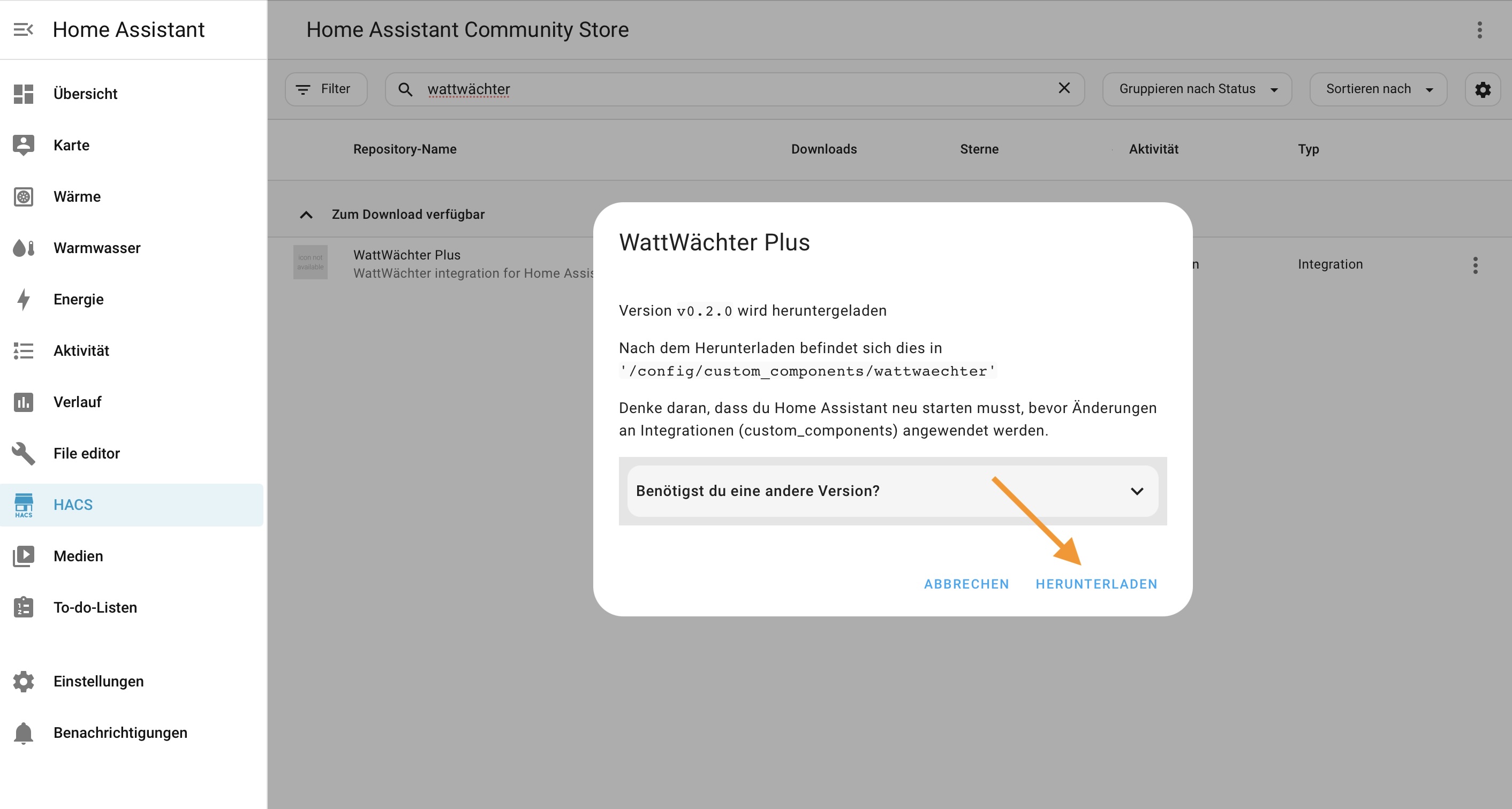 Wähle die gewünschte Version aus (standardmäßig die neueste) und klicke auf Herunterladen. Die Integration wird nach /config/custom_components/wattwaechter heruntergeladen.