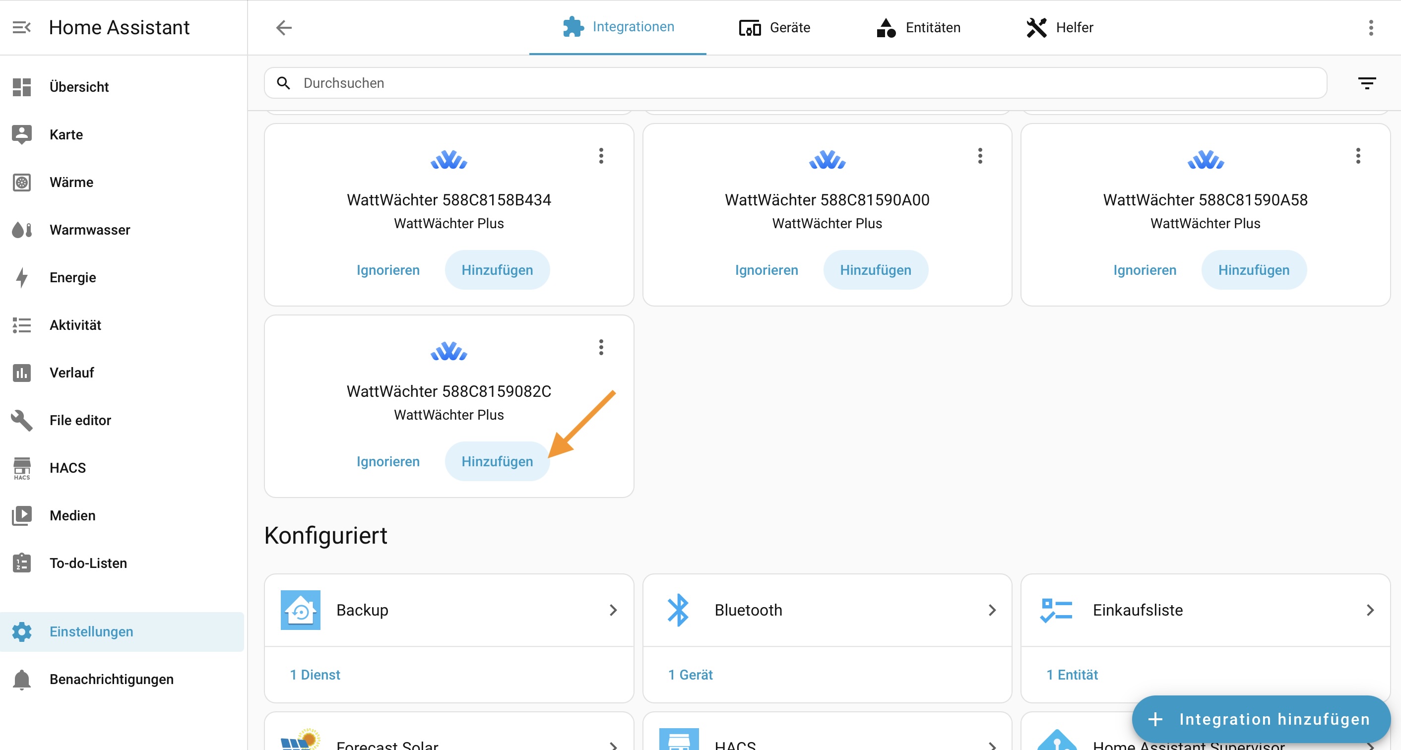 Du kannst das Gerät auch manuell hinzufügen: Einstellungen > Geräte & Dienste > Integration hinzufügen > WattWächter und die IP-Adresse eingeben.