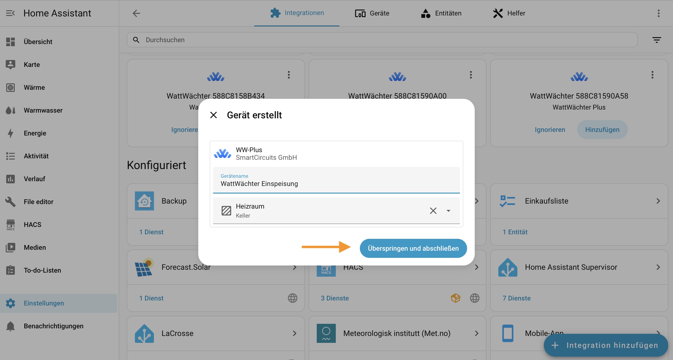 Nach der Konfiguration kannst du dem Gerät einen Namen und einen Bereich zuweisen (z.B. "WattWächter Einspeisung" im Bereich "Keller"). Klicke auf Überspringen und abschließen, wenn du dies später einrichten möchtest.
