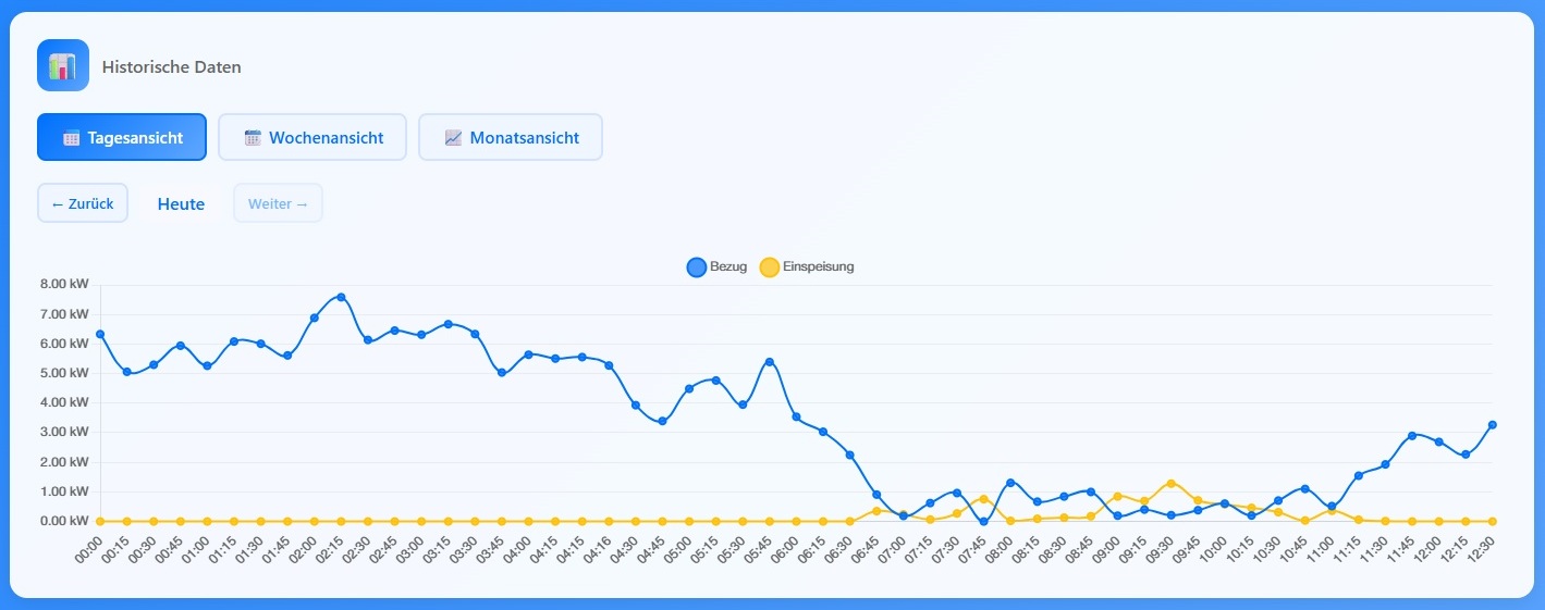 Jede Ansicht zeigt Bezug (Import) und Einspeisung (Export) als separate Datenreihen. Mit den Vor-/Zurück-Buttons kannst du durch die Zeiträume navigieren.