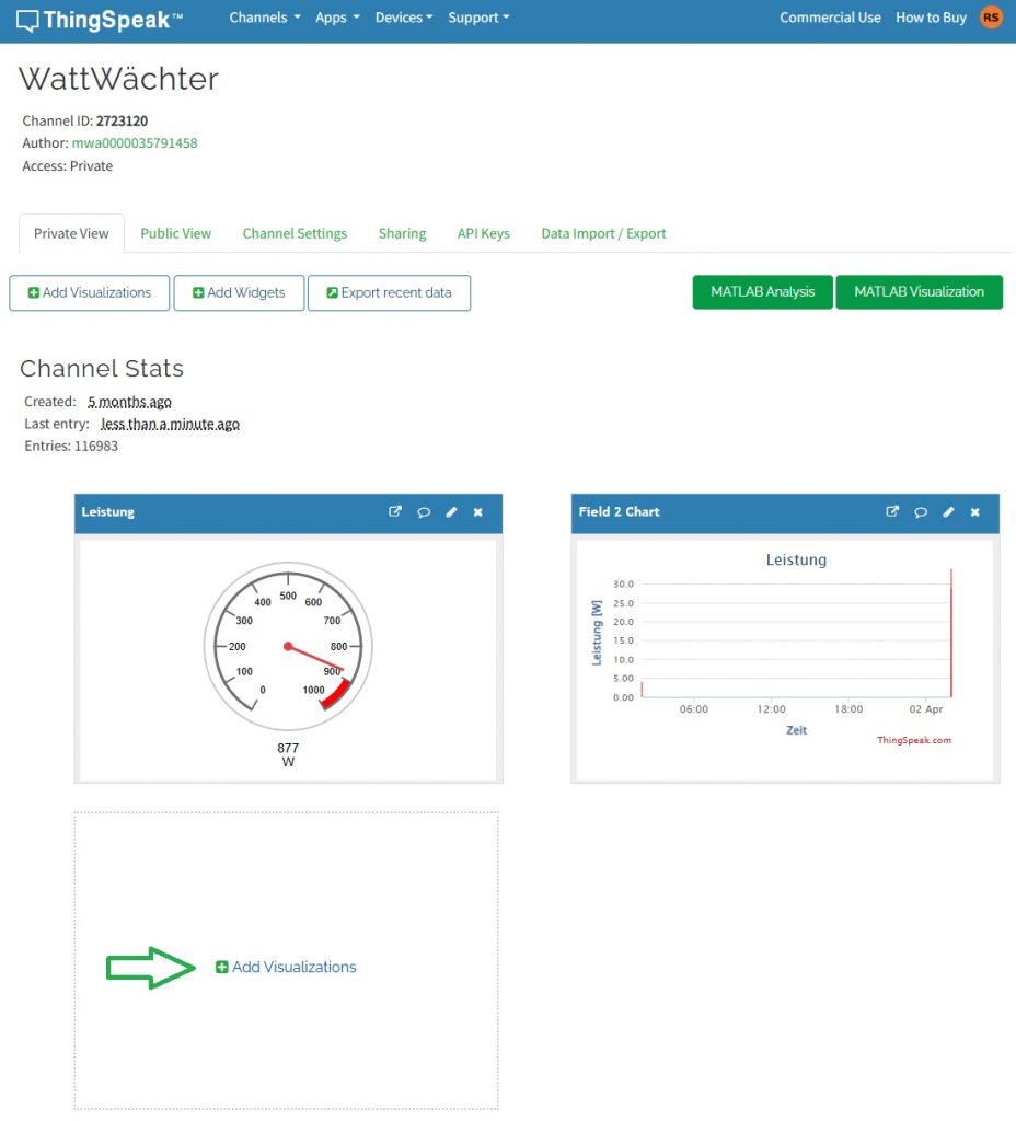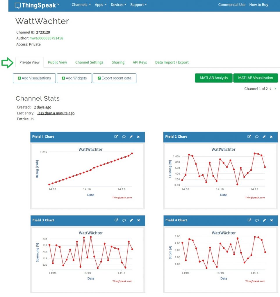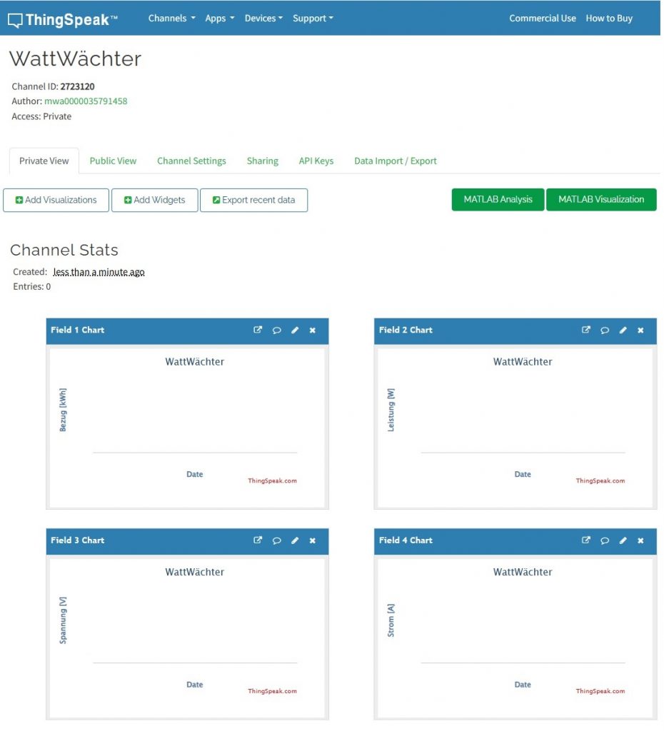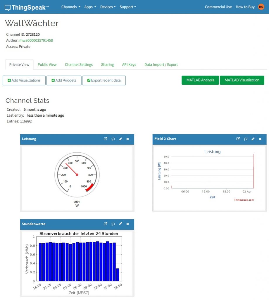 Wenn die Daten des Stromzählers mit dem WattWächter WiFi/USB ausgelesen werden, kommt natürlich der Wunsch auf, diese Daten zu speichern und zu visualisieren. Nicht jeder betreibt ein Hausautomationssystem, das dies übernehmen kann. In dem Fall besteht die Möglichkeit, die Daten in die Cloud von ThingSpeak hochzuladen und dort zu verarbeiten.