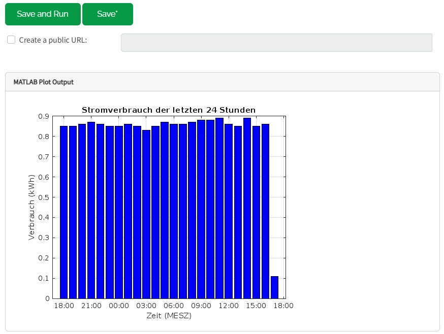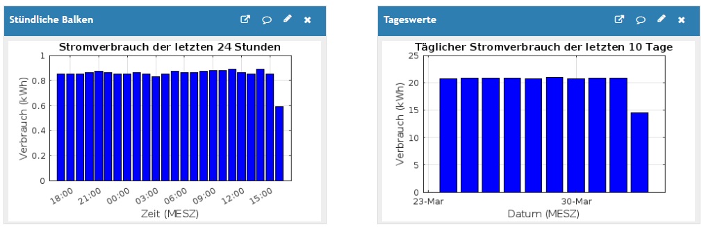 Möchte man Balkengrafiken mit dem stündlichen Verbrauch der letzten 24 Stunden oder mit dem täglichen Verbrauch der letzten 10 Tage erzeugen, so lässt sich dies mit der integrierten MATLAB-Funktionalität realisieren.