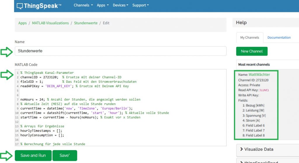 Im nächsten Dialog muss ein Name für das Modul vergeben und der entsprechende MATLAB-Code eingefügt werden. Im Code müssen in den ersten drei Zeilen die channelID, die fieldID und der readAPIKey angegeben werden. Die Field-ID muss sich auf das Feld beziehen, das die bezogenen kWh speichert (im Beispiel Feld 1: Bezug).