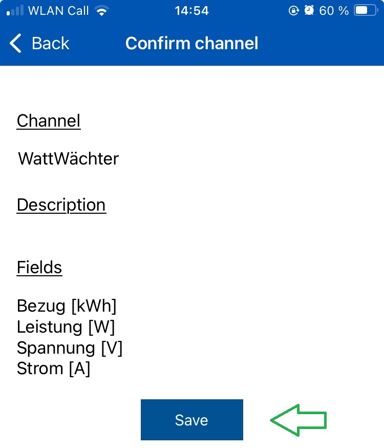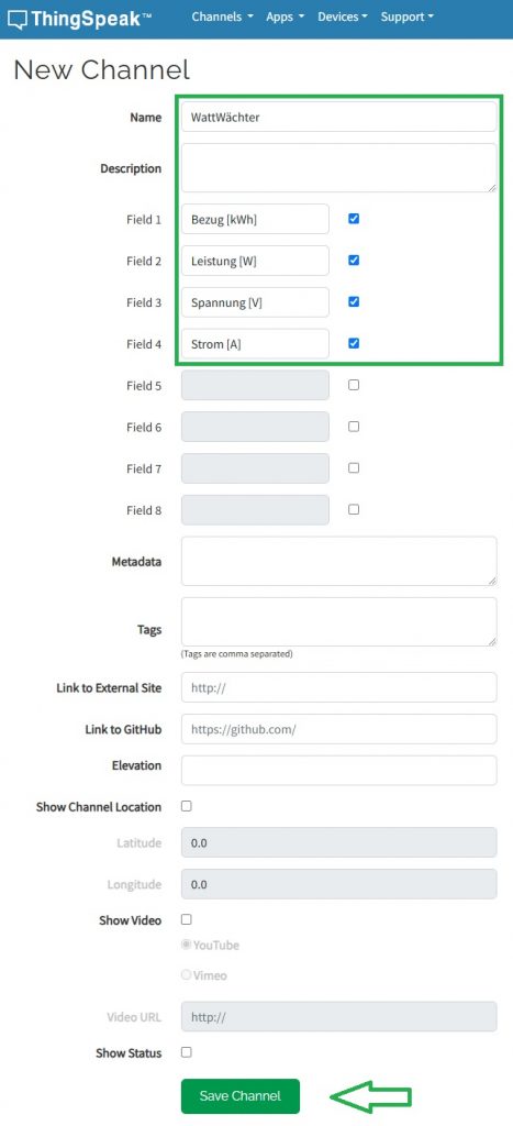 Hier kann nun ein Name für den Kanal und optional eine Beschreibung vergeben werden. In jedem Kanal können bis zu acht Felder definiert werden. Im nachfolgenden Beispiel wurden vier Felder für den Bezug, die Leistung, die Einspeisung und den Strom definiert. Mit einem Klick auf "Save Channel" werden die Eingaben gespeichert.