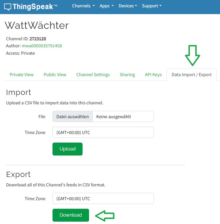 Möchte man die Daten, die an ThingSpeak übertragen wurden, exportieren, um sie z.B. in Excel auszuwerten, so ist dies im Bereich "Data Import / Export" des Kanals möglich. Durch einen Klick auf die Schaltfläche "Download" im Bereich "Export" können alle bisher gespeicherten Daten des Kanals als CSV-Datei heruntergeladen werden.