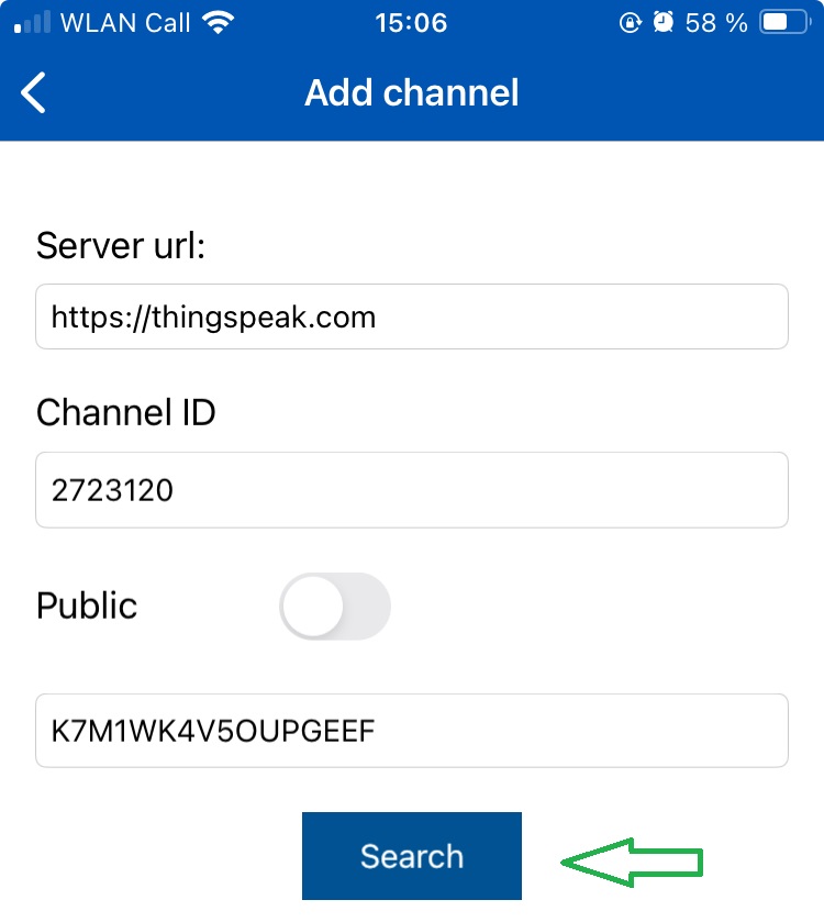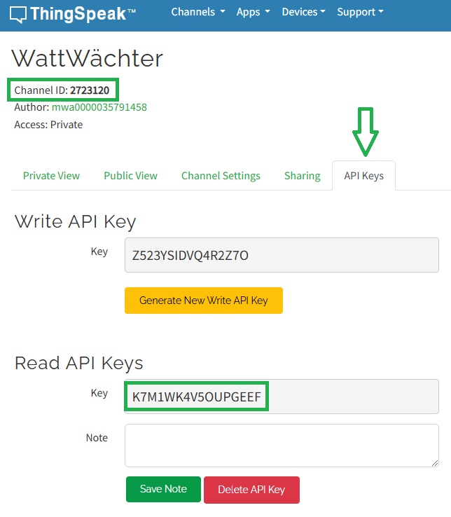Die nötige Channel ID lässt sich in ThingSpeak direkt unterhalb des Kanalnamens finden. Da es sich standardmäßig um einen privaten Kanal handelt, ist die Auswahl "Public" zu deaktivieren und der Lese-Schlüssel aus ThingSpeak einzutragen. Dieser befindet sich unter "API Keys" im Bereich "Read API Keys".