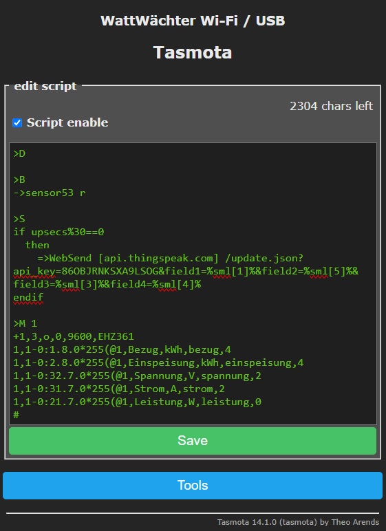 Nun muss das Skript angepasst werden, damit die Daten in die Cloud von ThingSpeak übertragen werden. Dazu im Menü "Tools" => "Edit Script" aufrufen. Im folgenden Beispiel wird ein Skript für den Hager EHZ361-Zähler verwendet.