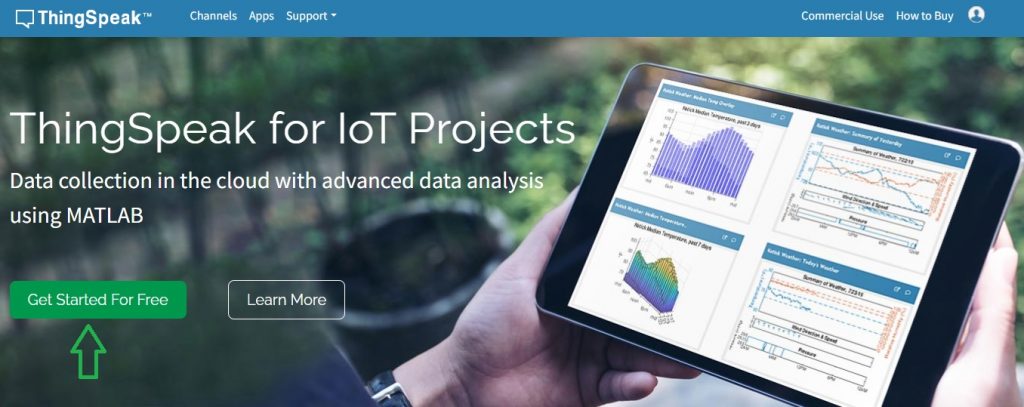 Um einen neuen Account bei ThingSpeak anzulegen, öffnen Sie die Seite www.ThingSpeak.com und klicken Sie auf die Schaltfläche "Get Started For Free".
