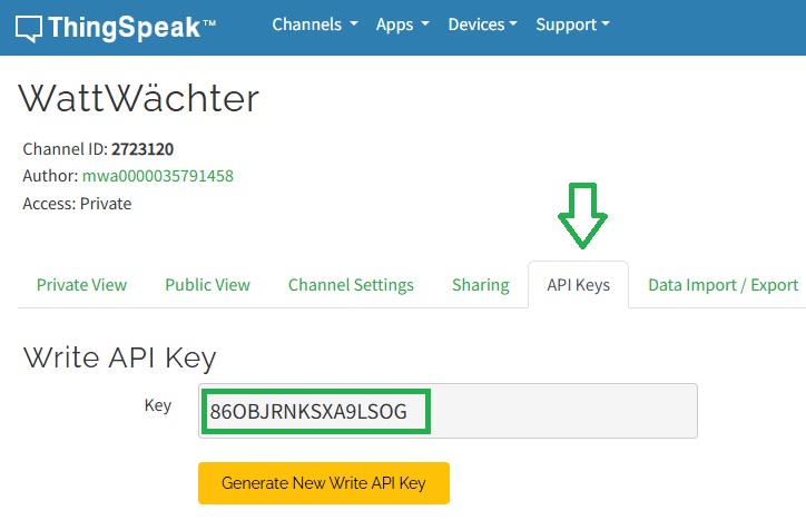 WriteKey-- Hier muss der Schlüssel eingetragen werden, der es erlaubt, in den Kanal zu schreiben. Diesen findet man in ThingSpeak unter "API Keys". -