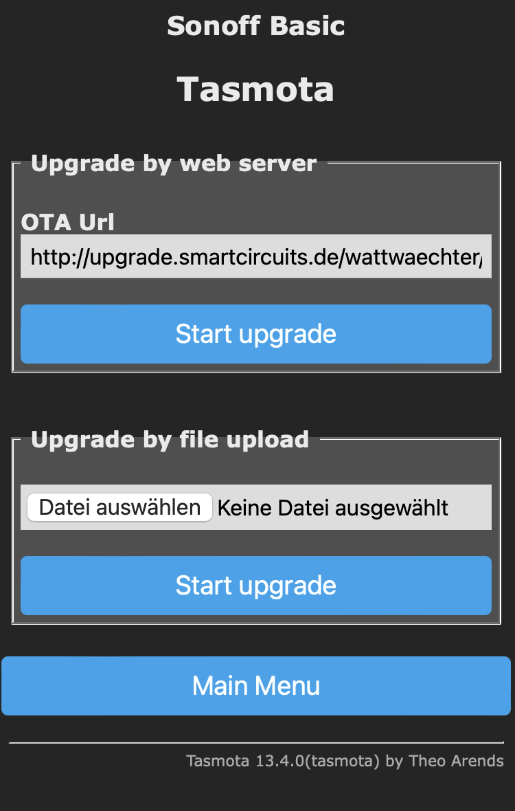 Die vorkonfigurierte Update-URL lautet: http://upgrade.smartcircuits.de/wattwaechter/latest/tasmota.bin.gz